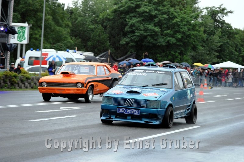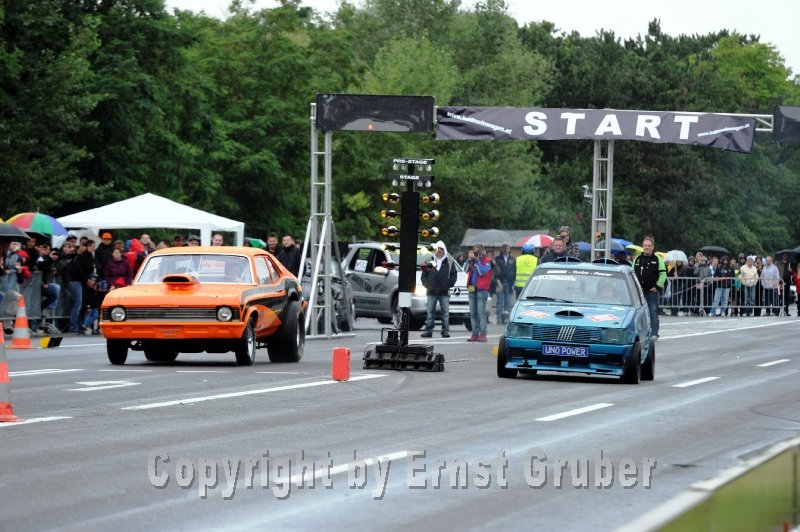 Schon am Samstag beim ersten Qualifikationlauf wurde die eigene Bestzeit um nur 5/100 sec. verfehlt(11,0021 sec.-202,46 km/h) und somit fix für die Finalläufe qualifiziert.Einige Zeit später kam die Rennleitung mit einer nicht geraden guten Nachricht zu mir.Auf Grund von Protesten (vermutlich von Porschefahrern) wurde ich in die höchste Klasse eingestuft und musste somit am Sonntag in der Klasse Competition Car wo Dragster bis zu 1700PS an der Qualifikation teilnahmen an den Start.