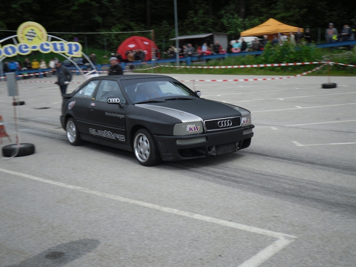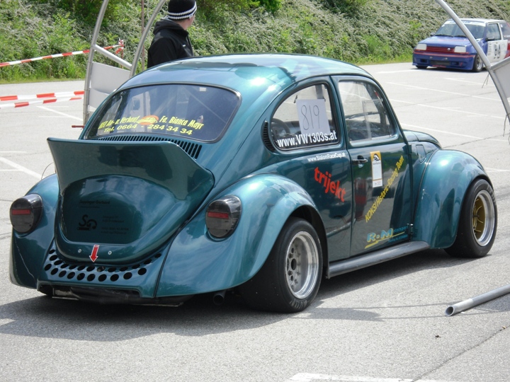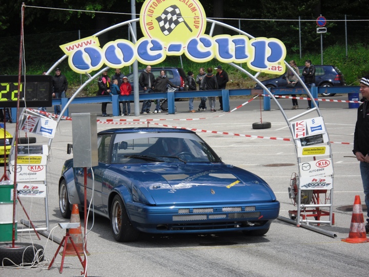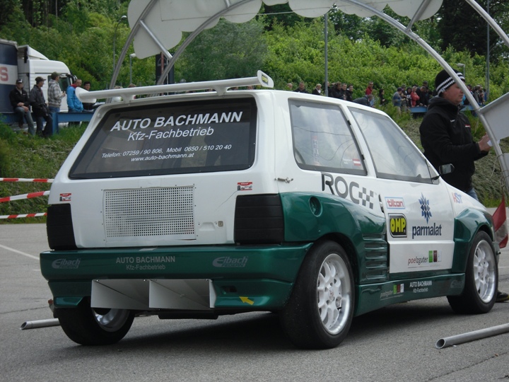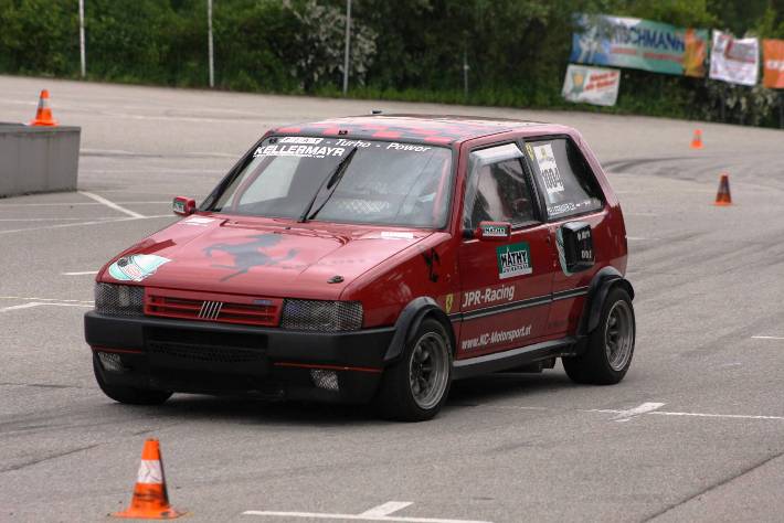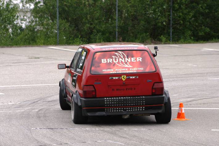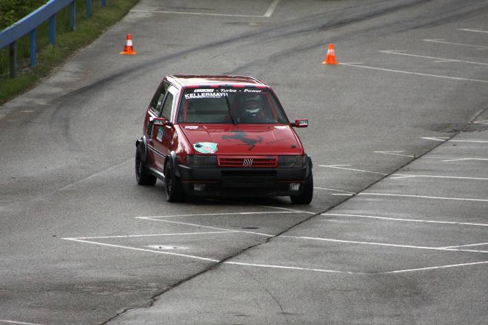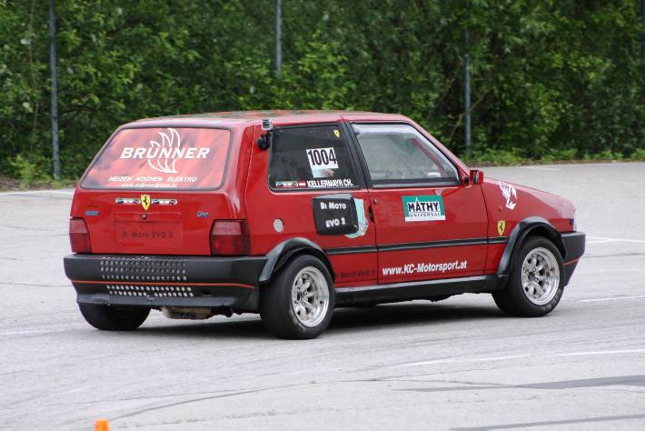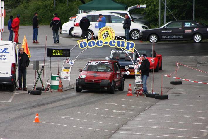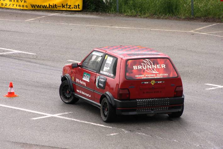Am Ende der Div II fing es zu regnen an, so das ich die beiden Trainingsläufe mit Regenreifen absolvierte. Mit nachlassen des Regen trocknete die Strecke rasch auf. Mit Hilfe von Martin u. Franz Dall wurden die Slicks innerhalb weniger Minuten montiert. Darauf hin gelang mir auf anhieb eine super schnelle Zeit. Die Freude über das Fahrverhalten nach einer Achsvermessung einiger Tage zuvor,(hierfür möchte ich mich bei Franz u. Martin Dall nochmals herzlich bedanken) hielt nicht lange an. Stand ich zum 2. Wertungslauf schon am Vorstart, fing es wieder stark zu Regnen an. Der dritte Platz wäre das angestrebte Ziel gewesen, war aber somit unmöglich noch so eine schnelle Zeit in die Wertung zu bekommen. Am Ende reichte die einzige Zeit im Trockenen für den 4.Gesamtrang nur 1/100 sec. hinter den 3.platzierten Franz Wirleitner in der Div III und der 6.Platz in der Klasse 10.